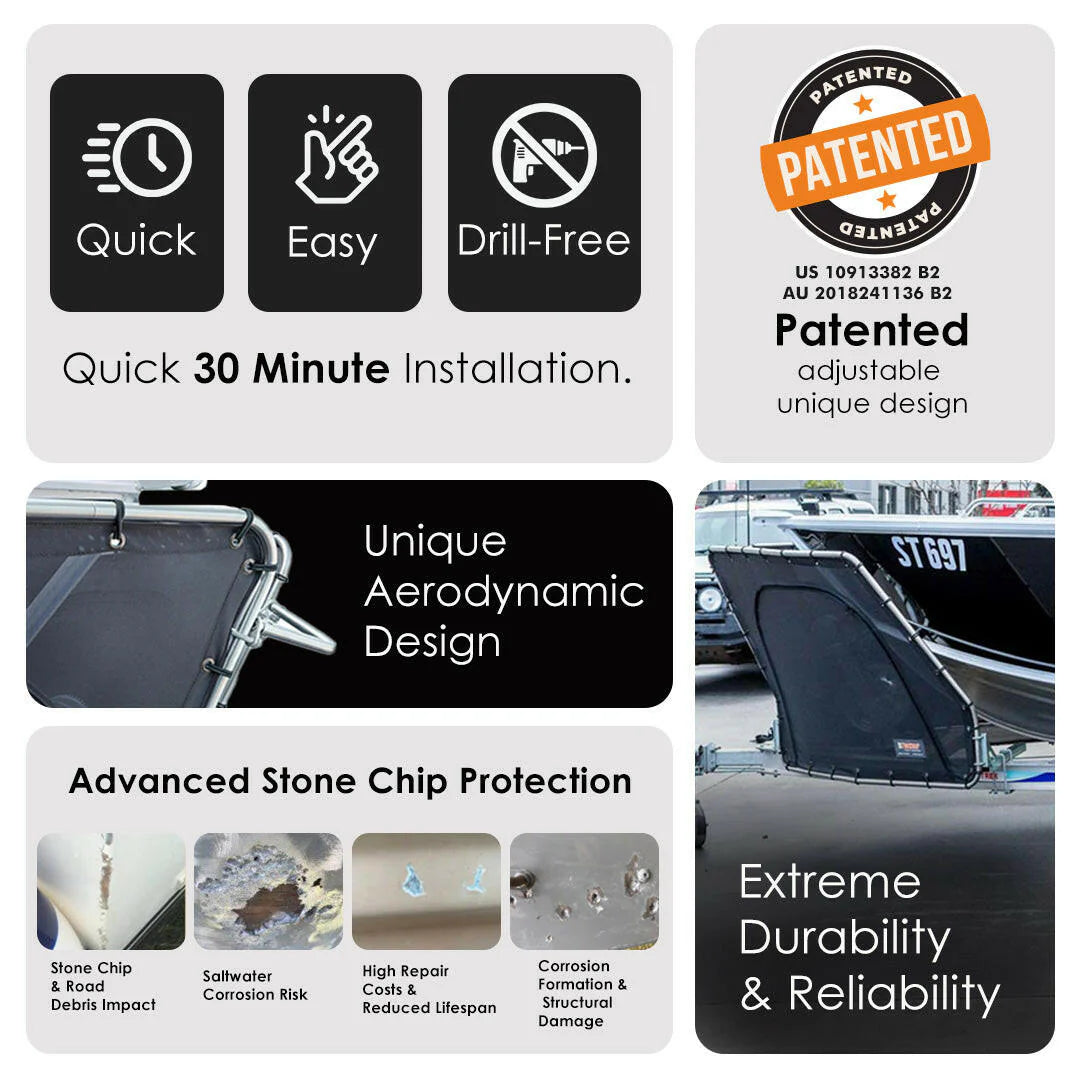 Keep your boat safe from road debris, stone chips, and other damage while towing with the D‑Flector Boat Stone Guard. Designed for Australian conditions, this premium guard features a strong marine-grade 316 stainless steel frame and heavy-duty mesh. It fits boats from 4.2 to 8.5 metres and installs quickly with no drilling needed.