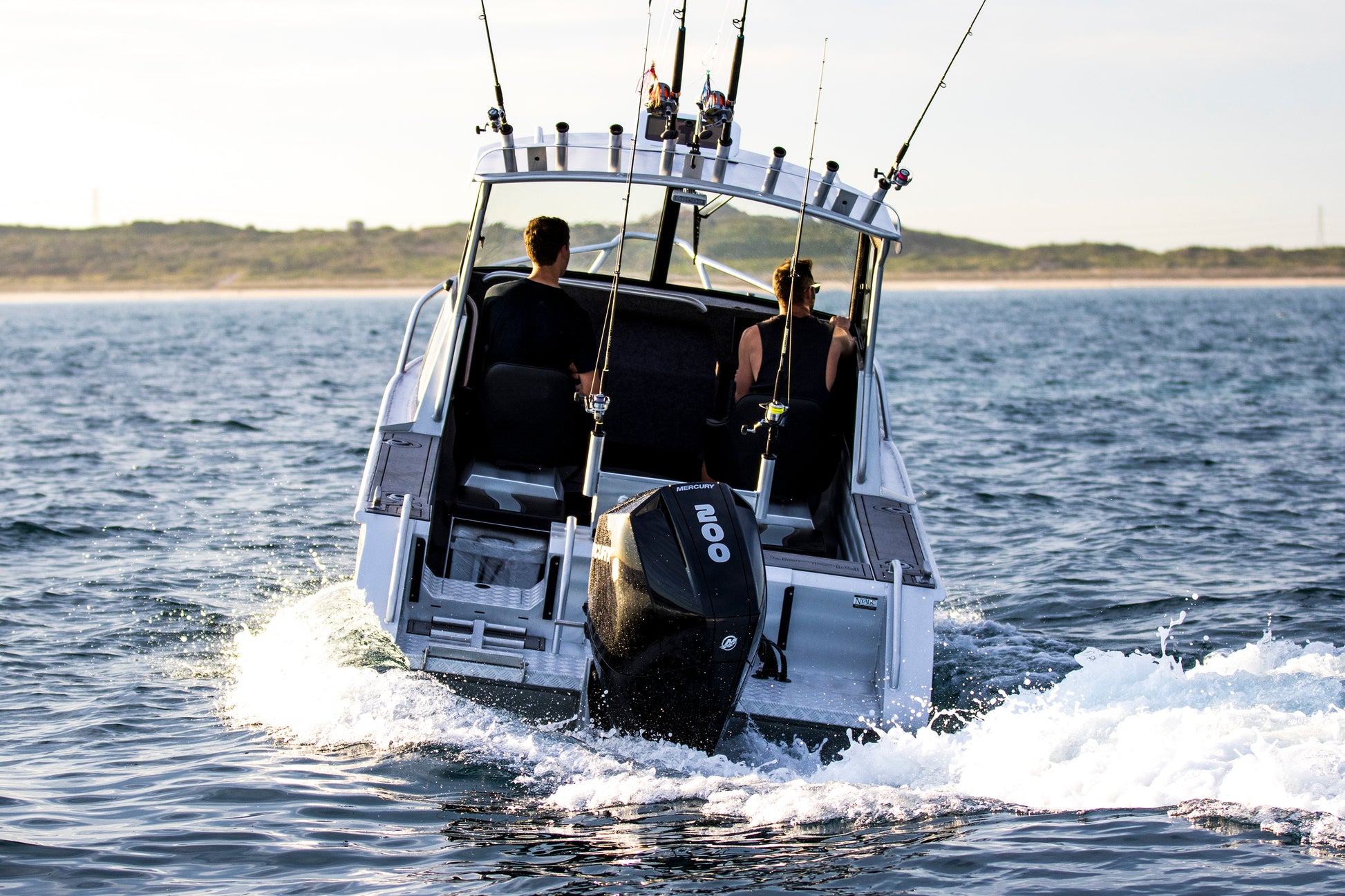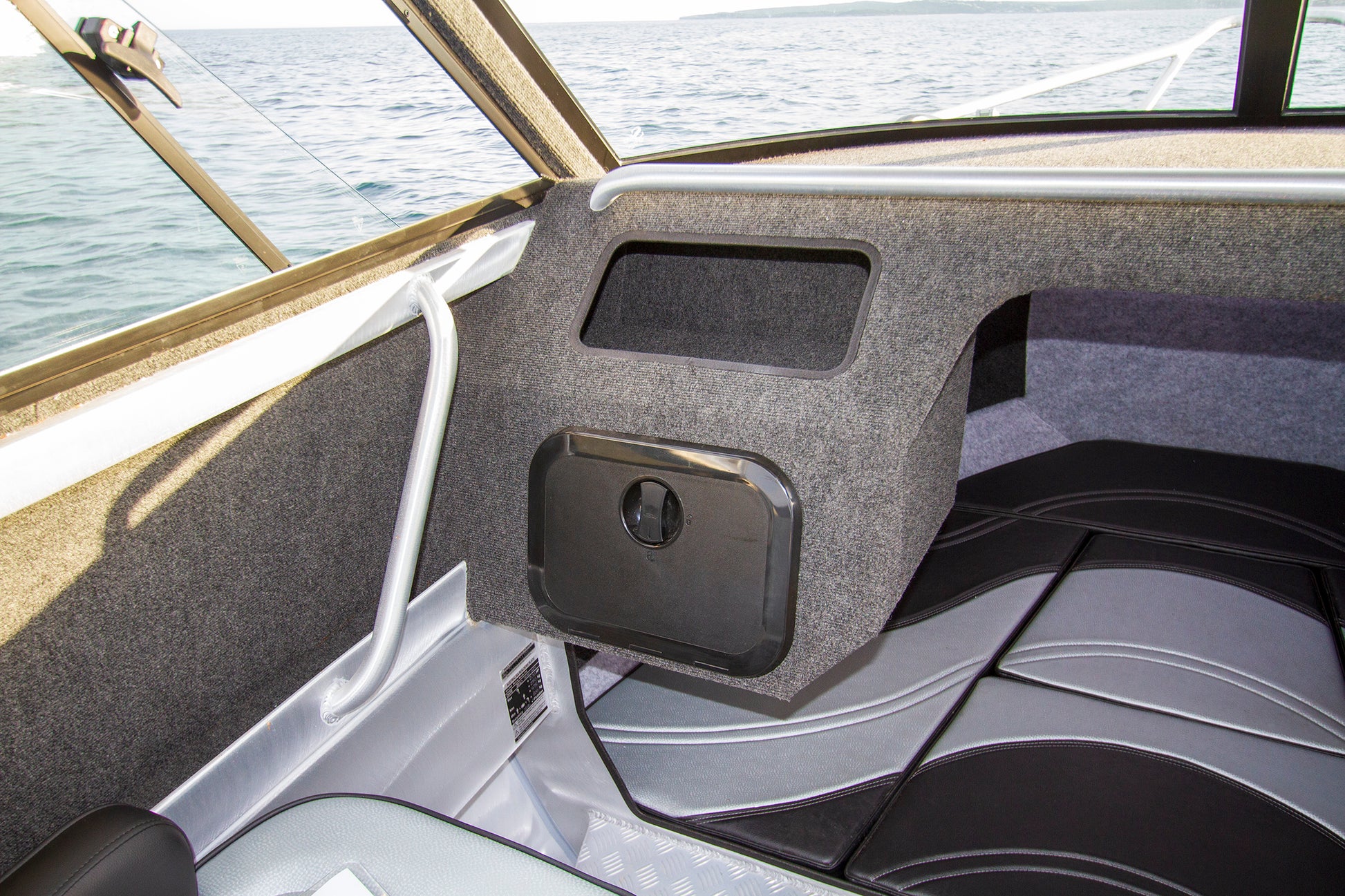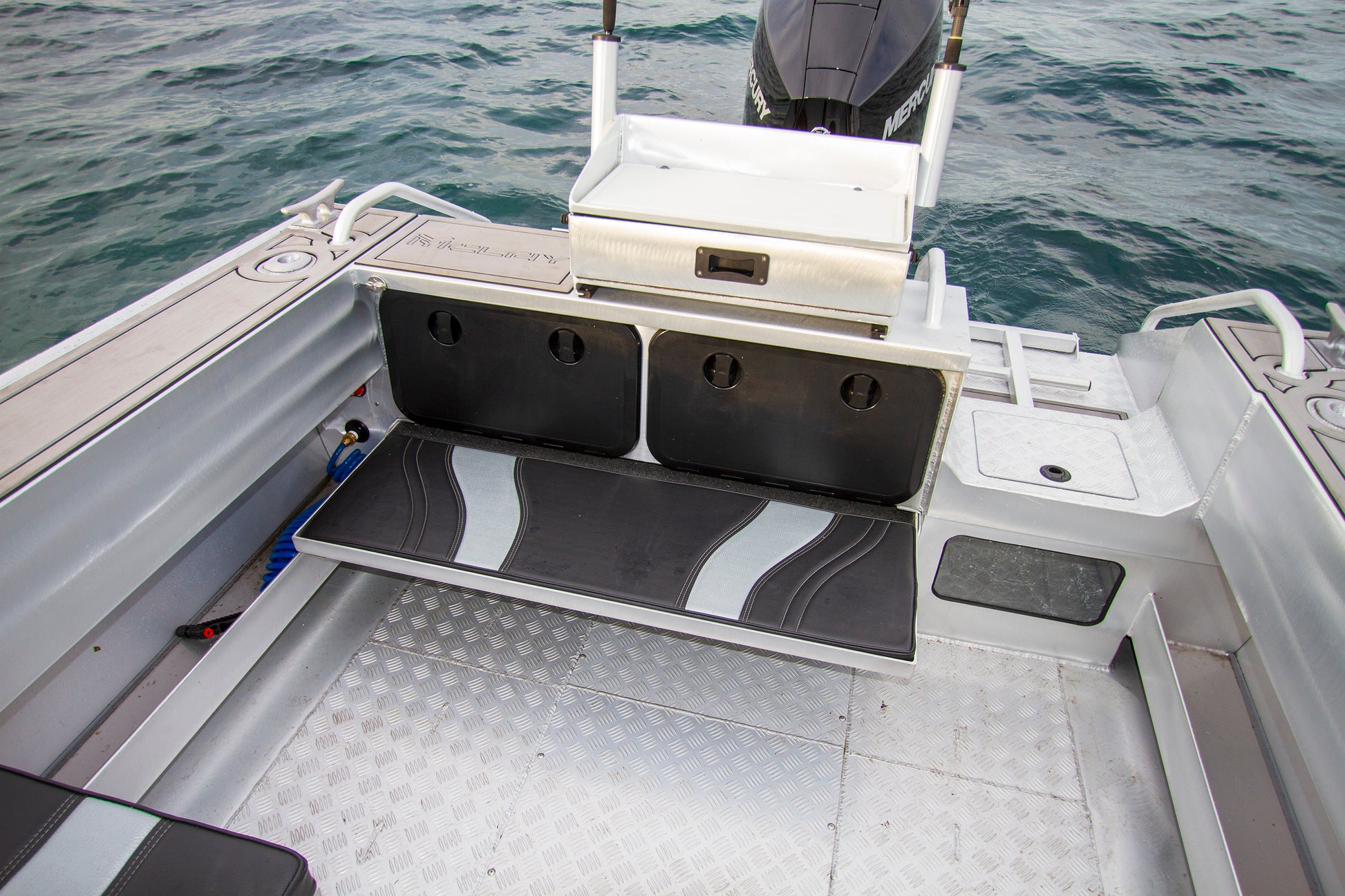 Standard features include hard top with sliding windows, 165 litre underfoor fuel tank, 4 alloy rod holders, full bow rail, keel wear strip, transom platforms, roof and deck grab rails, fold up back seat, hydraulic steering, lined hardtop and dash, lined cabin with upholstered cushions, live bait tank with perspex window, walk through transom with removable door, painted cabin roof with Nyalic clear coat hull, deluxe driver and passenger seats and large glove box.