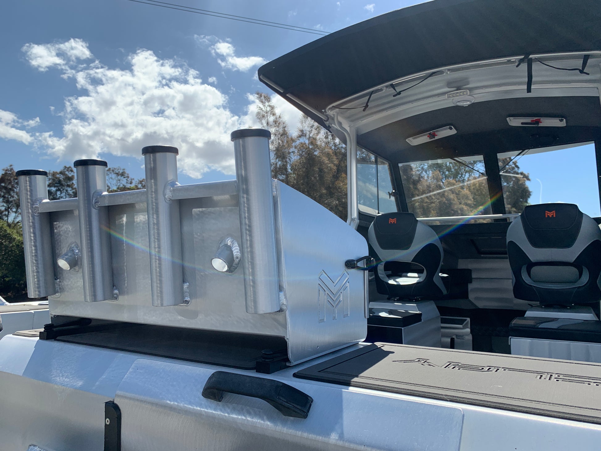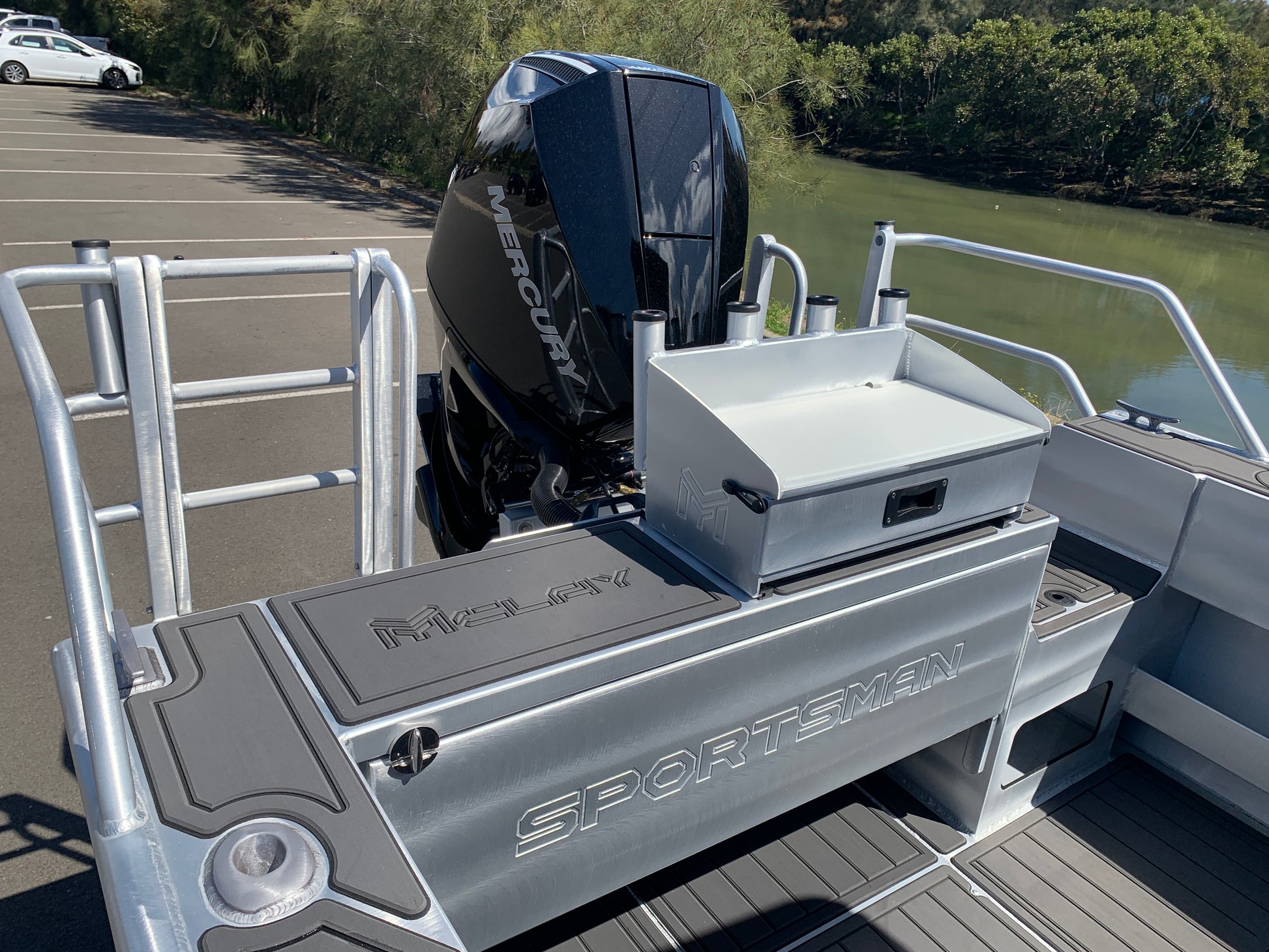 - Rear cage with fold down ladders & rod holders on tips