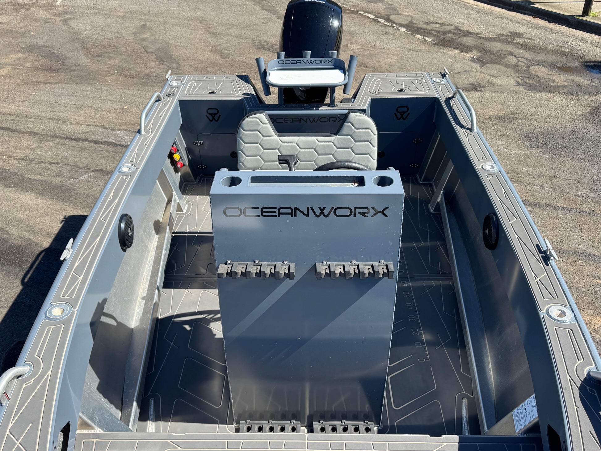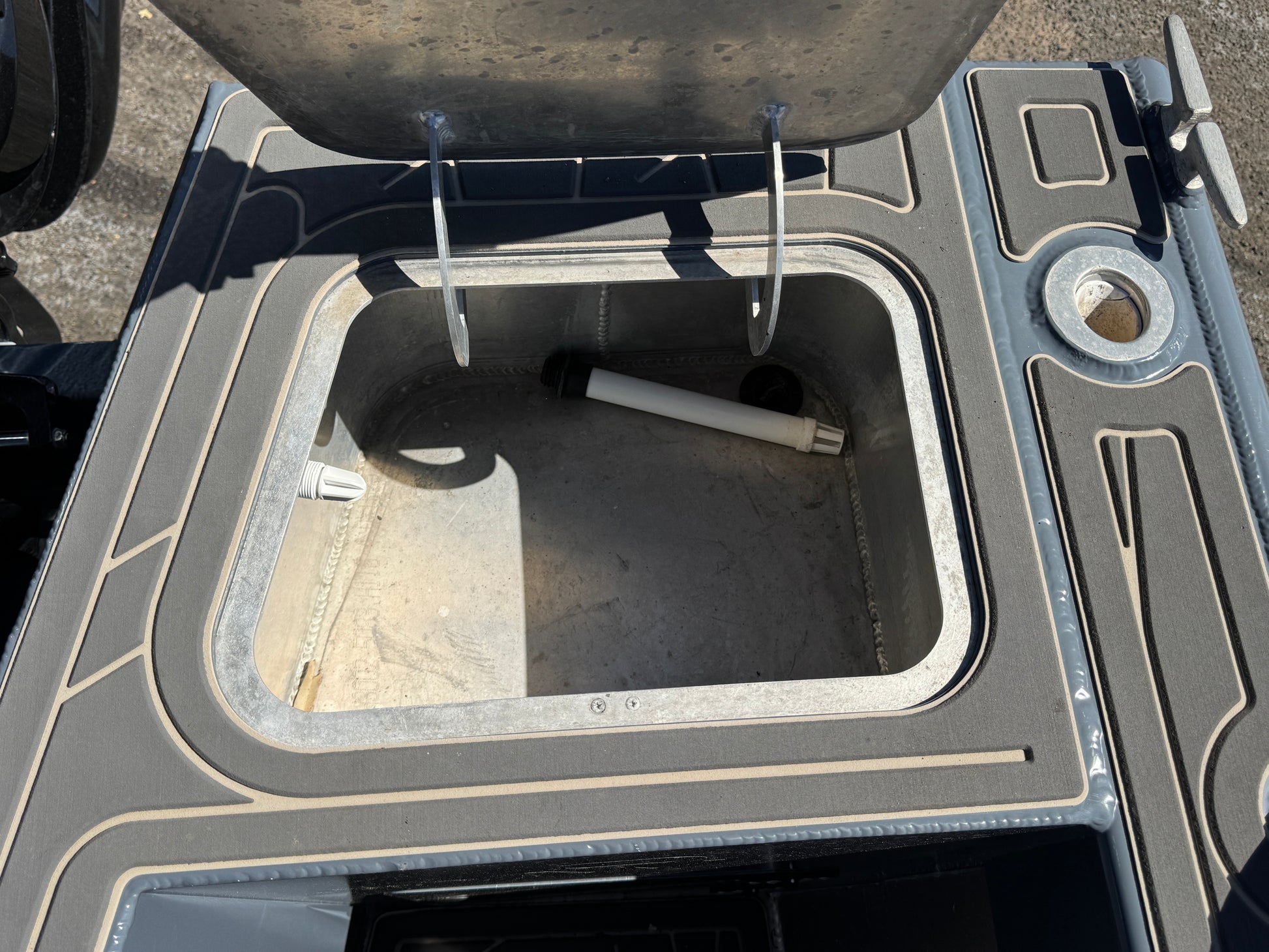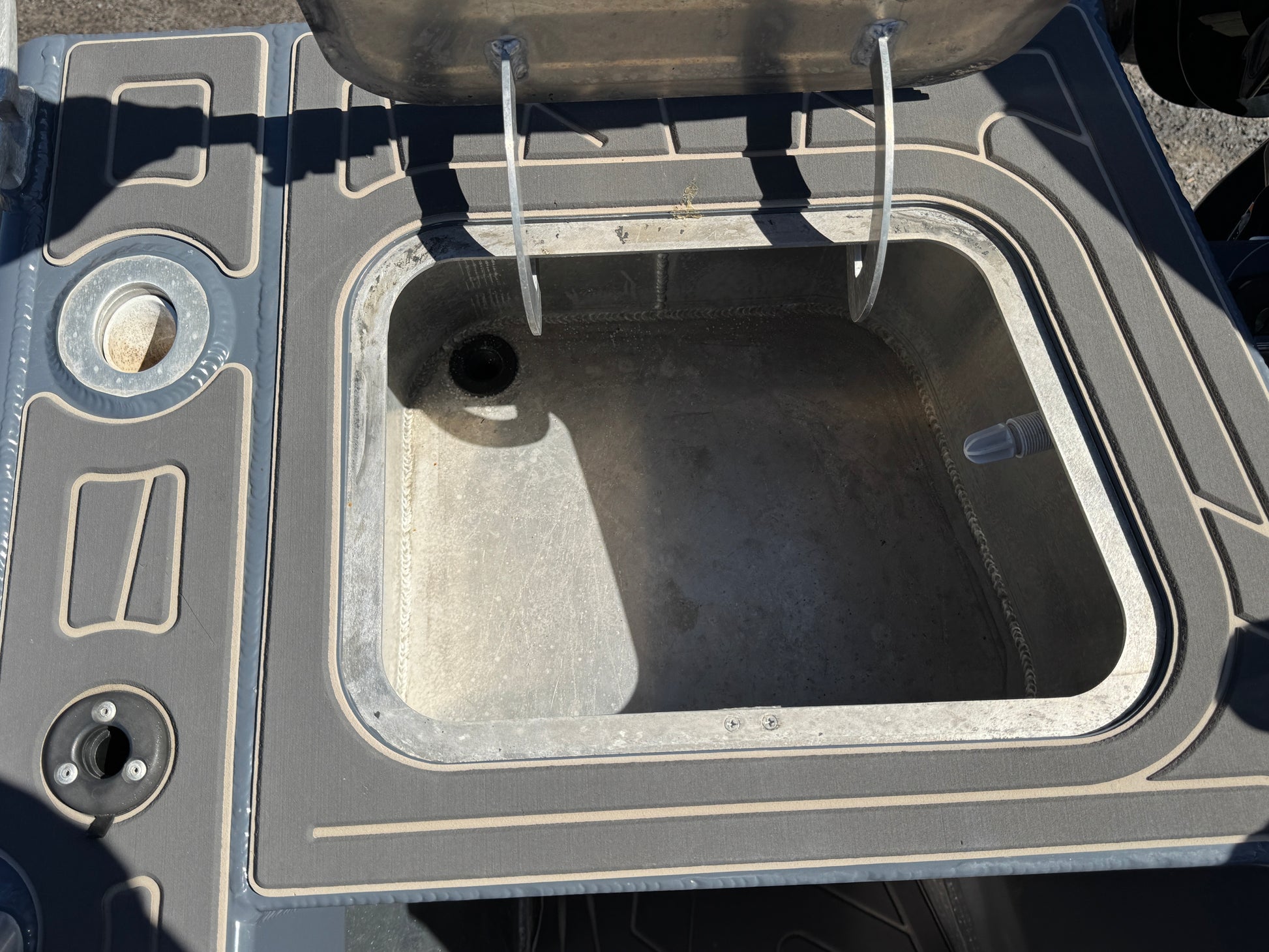 Enclosed transom, dual plumbed live bait tanks, removable bait board, U deck flooring, U deck side decks, Simrad 16" EVO 3s sounder, Simrad EVO 3s 12" sounder, mapping card, 1 kw HW through hull transducer, active 3n1 transducer, Motorguide 80lb 24v electric motor, 100ah Lithium 24v battery for electric and Roswell stereo.