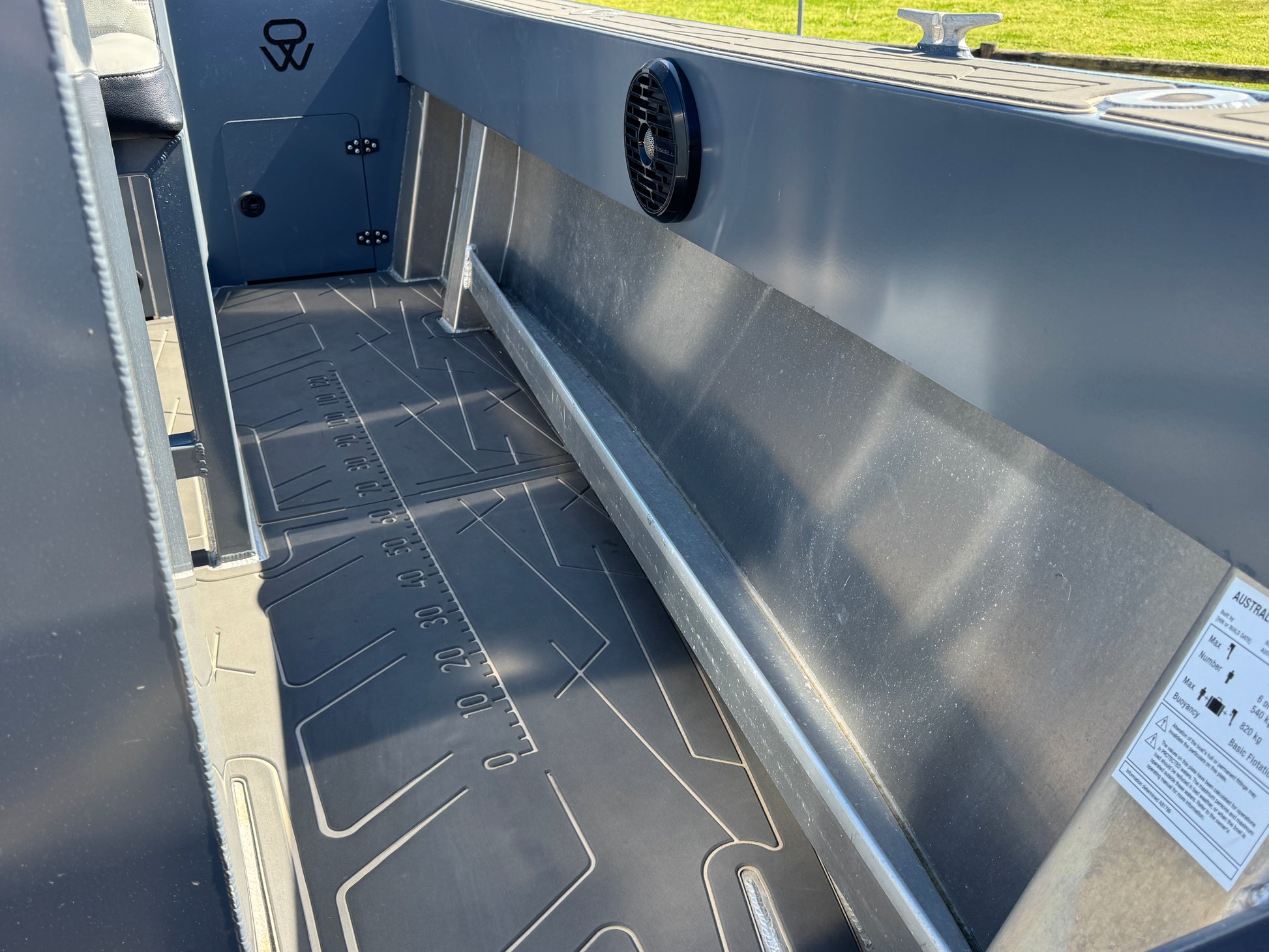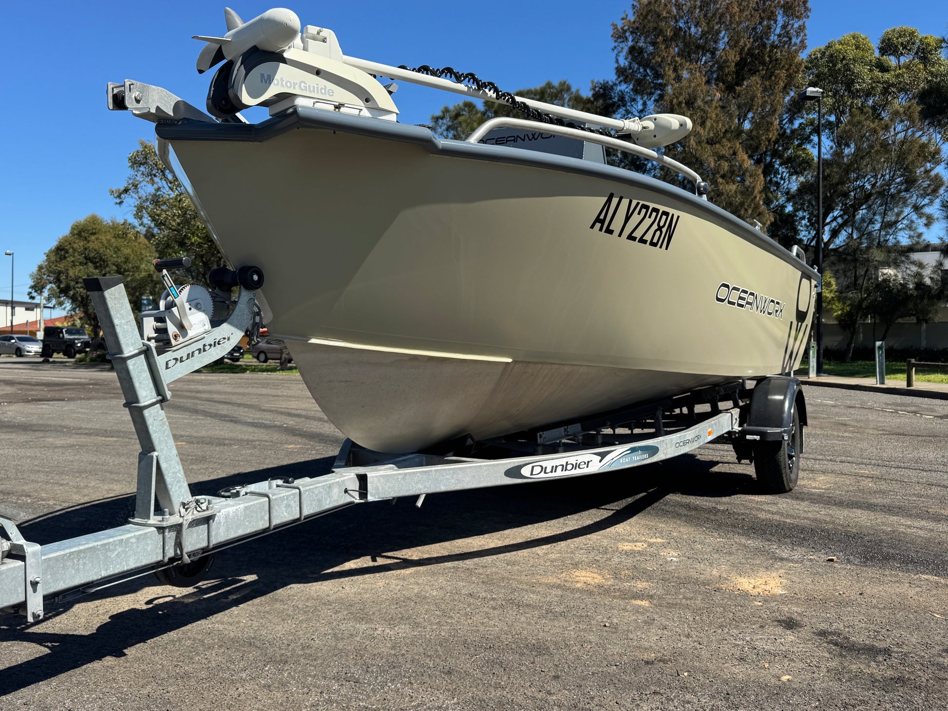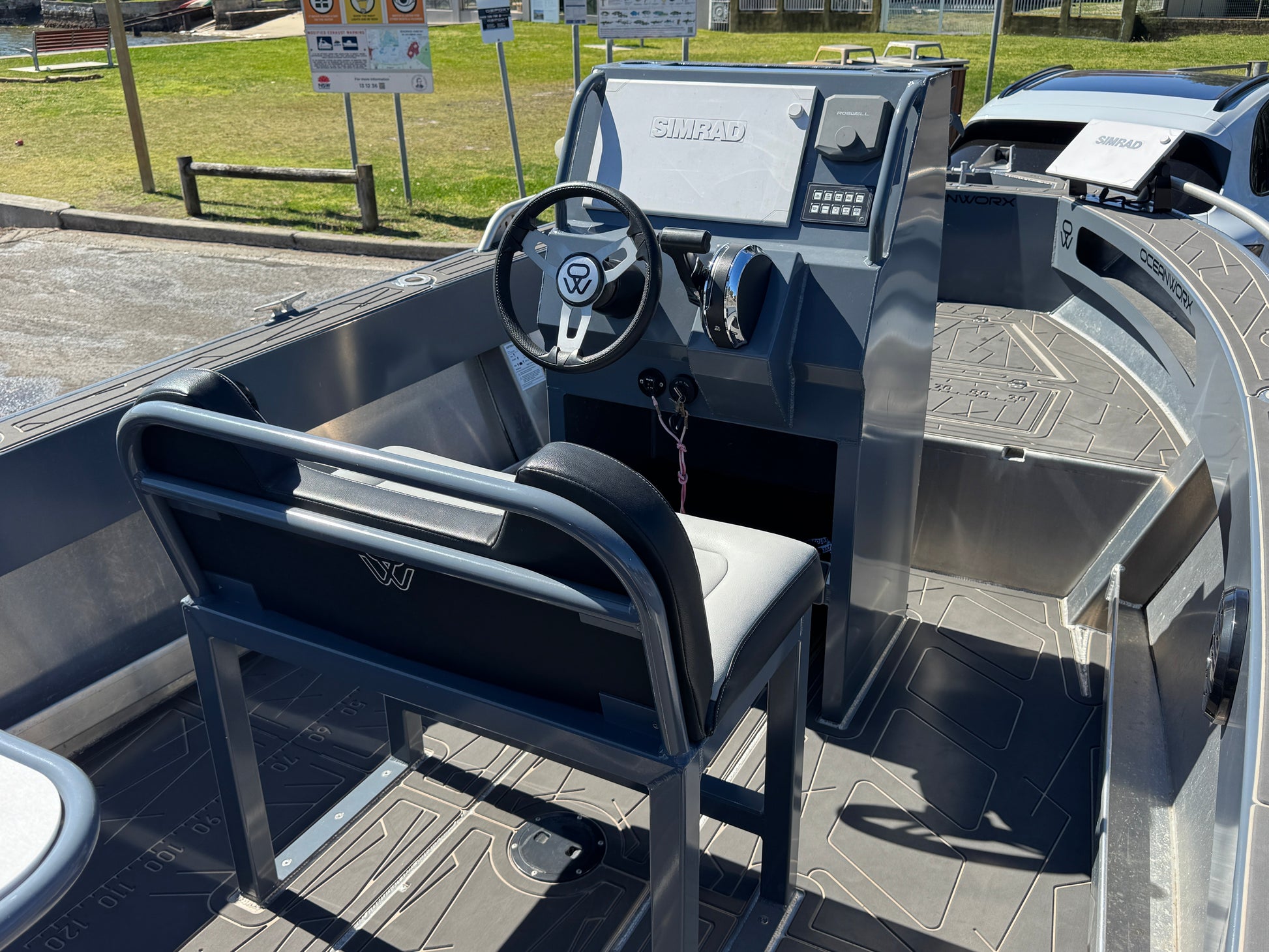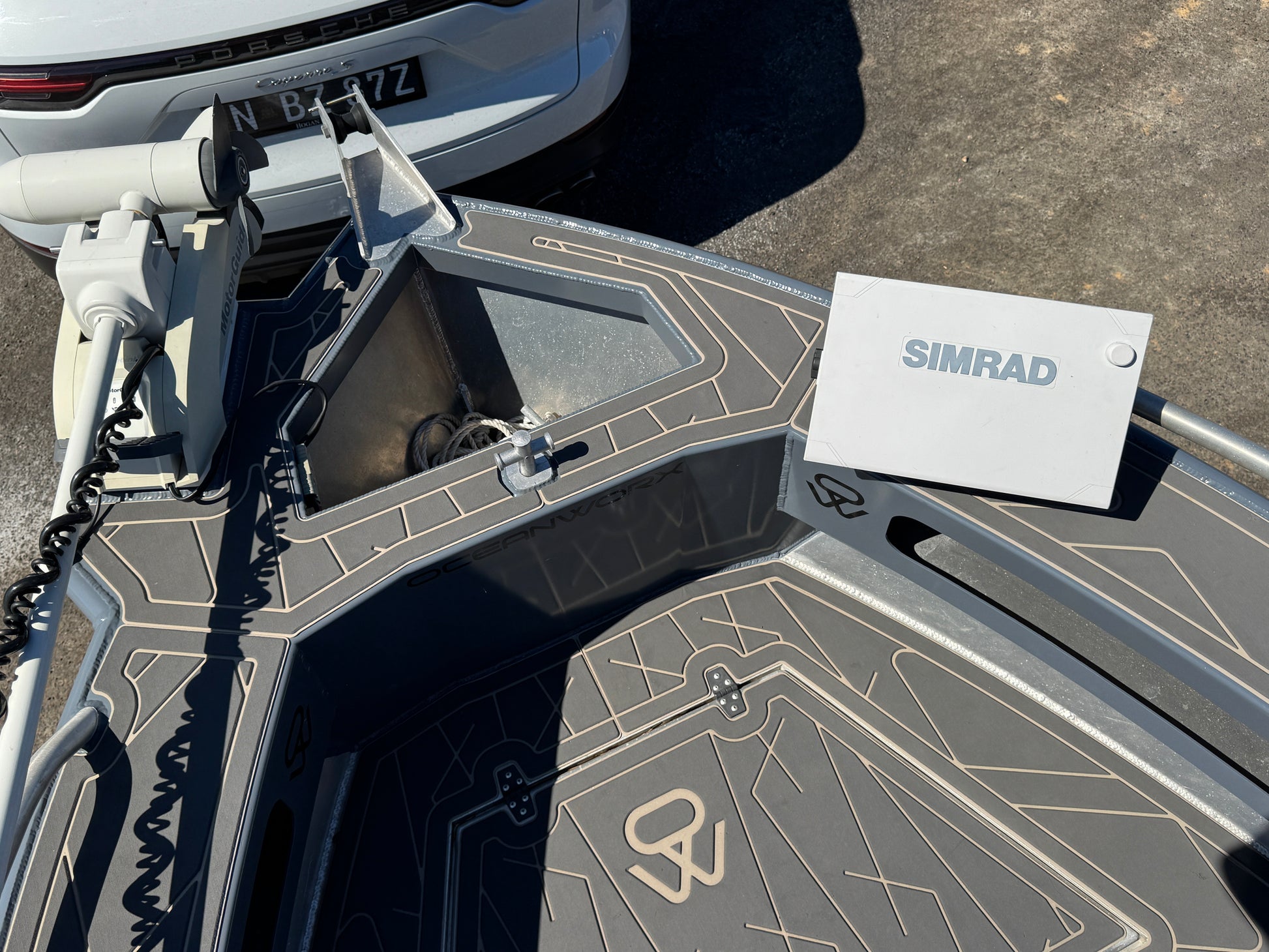 Enclosed transom, dual plumbed live bait tanks, removable bait board, U deck flooring, U deck side decks, Simrad 16" EVO 3s sounder, Simrad EVO 3s 12" sounder, mapping card, 1 kw HW through hull transducer, active 3n1 transducer, Motorguide 80lb 24v electric motor, 100ah Lithium 24v battery for electric and Roswell stereo.